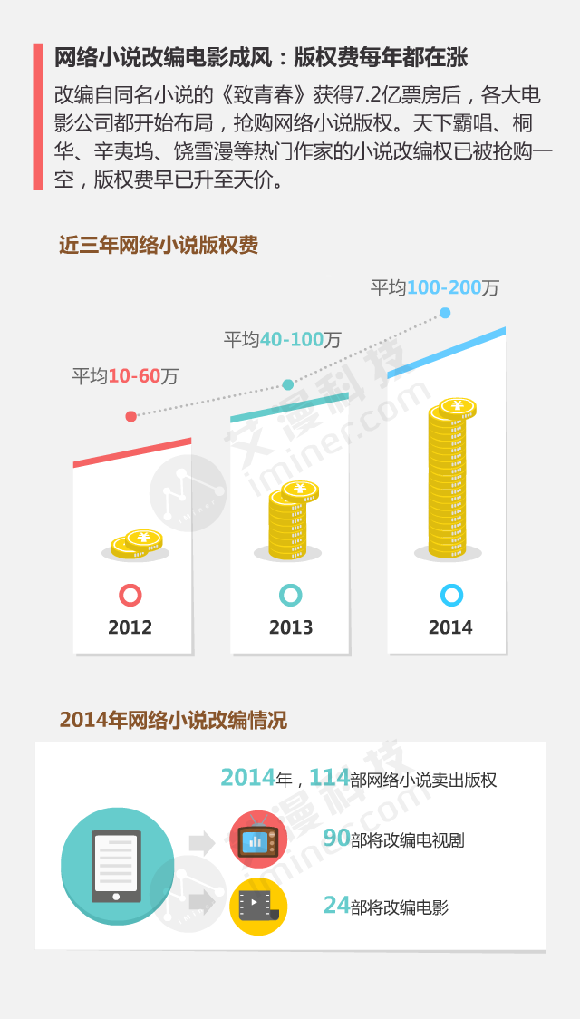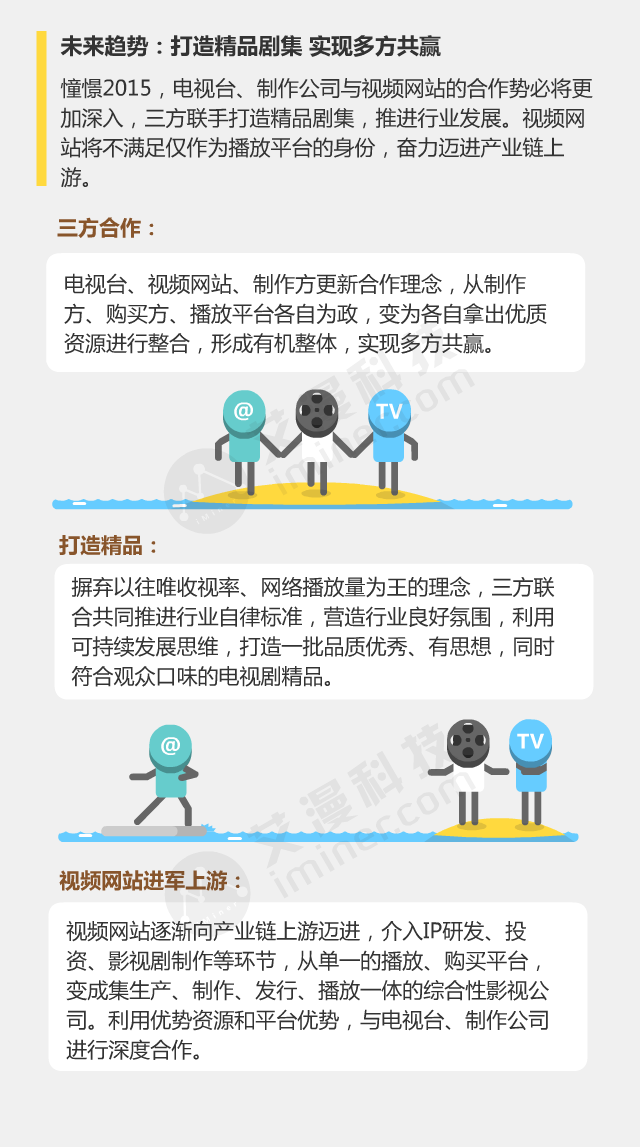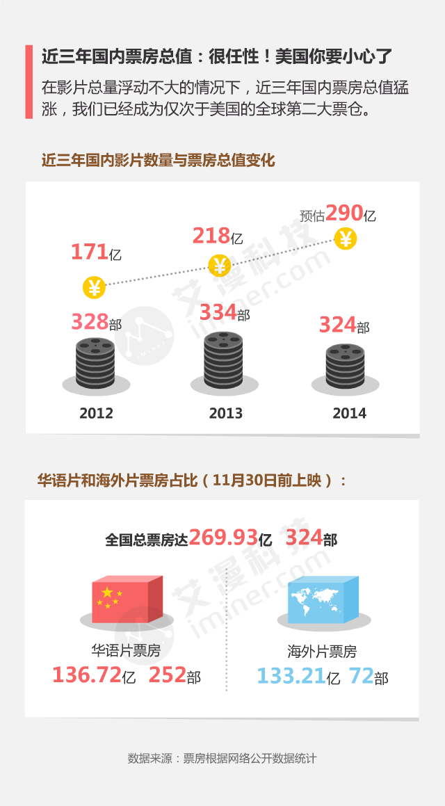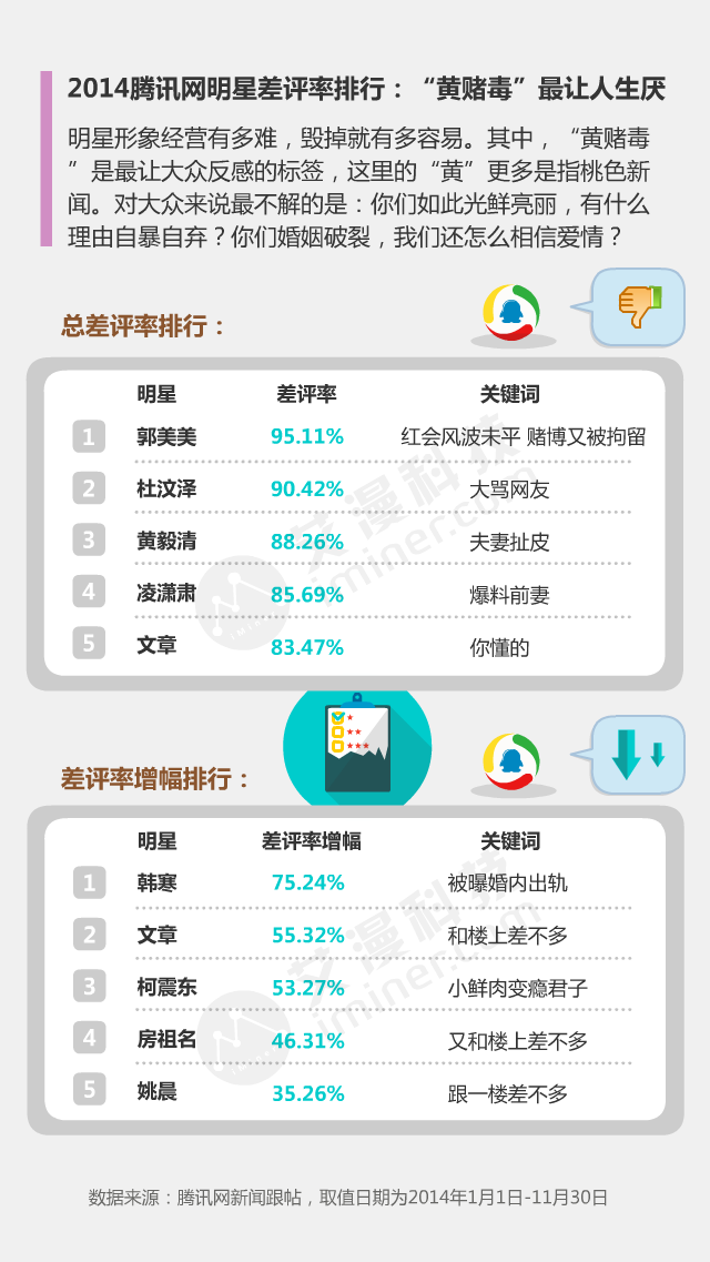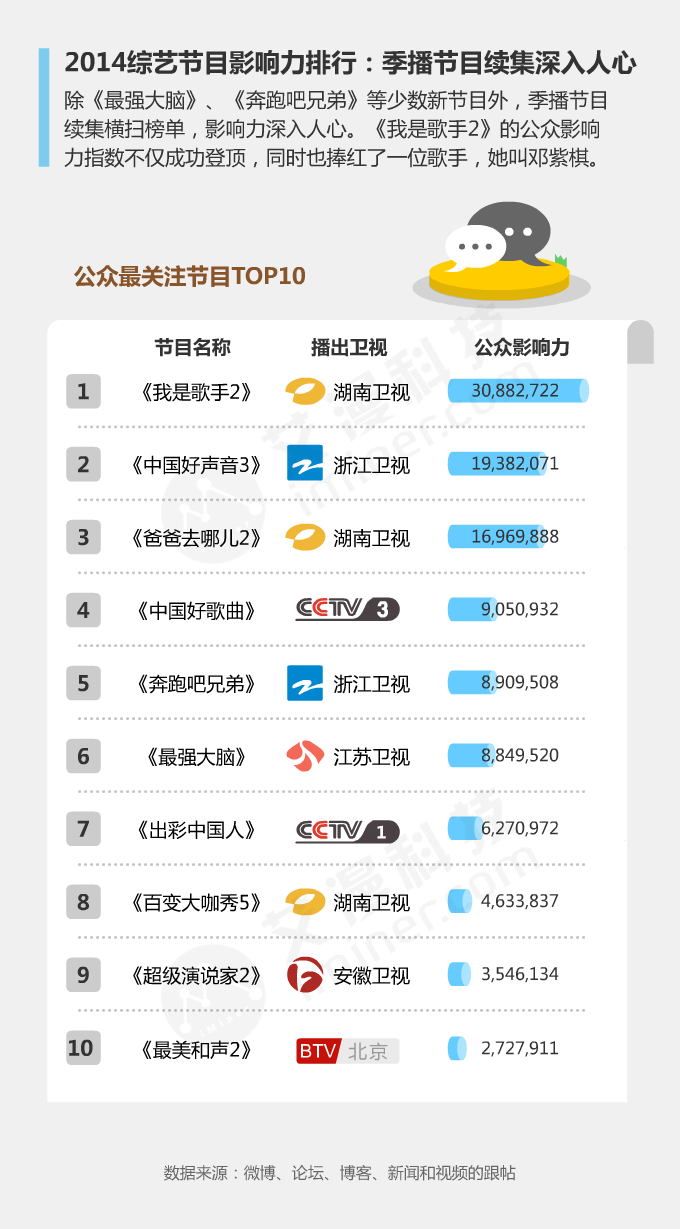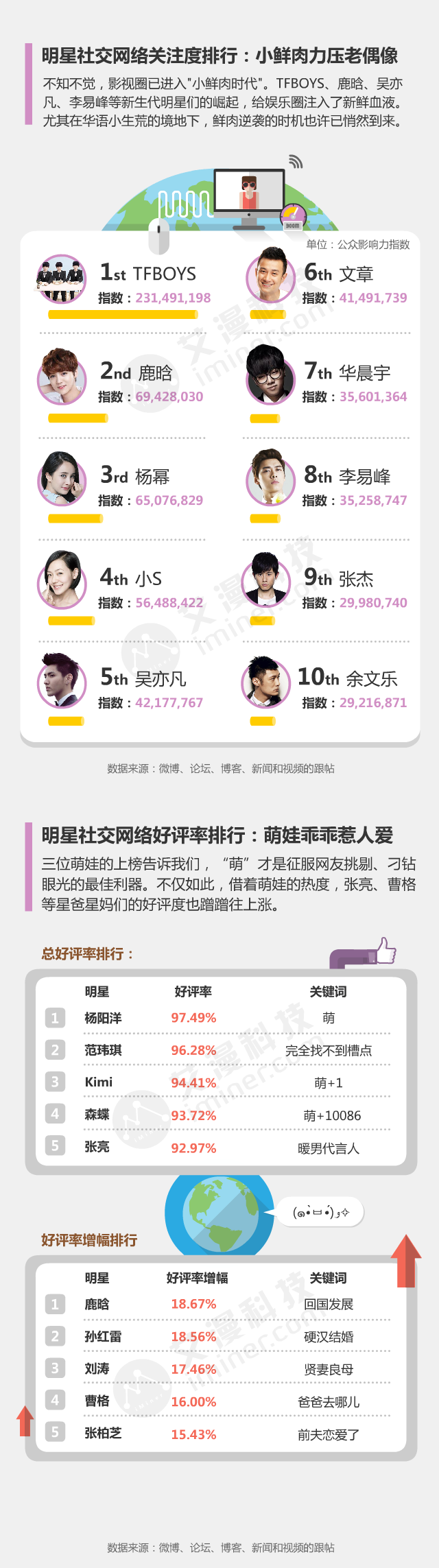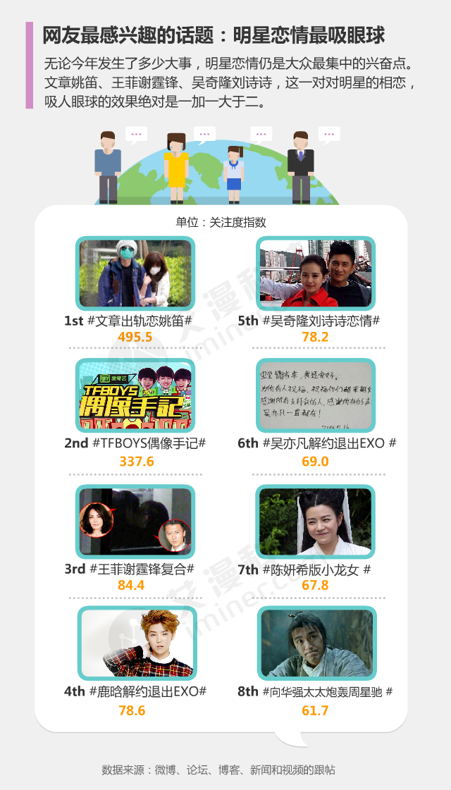 基于这样的追求,我们的编辑部用超过两个月的时间,选择电影、电视、综艺、音乐、明星五个方向,处理繁杂数据,讨论业界趋势,经过精心编辑和设计,推出了《2014腾讯娱乐白皮书》。这一年,这个行业的变化令人目眩:互联网新势力渗透到娱乐各业,与传统影视制作力量相抗衡;互联网公司参投电影、自制综艺节目与电视剧、举办线上演唱会——身份从推广平台转为内容制作商,从产业下游晋身产业上游;移动平台全面崛起,无论是看新闻听音乐还是欣赏影视节目,中国网民将目光从PC电脑屏幕,挪向了手机和PAD屏幕;90后成消费主流,他们的偶像——TFboys、鹿晗、吴亦凡等小鲜肉重拳出击,大有将一干前辈打在沙滩上之势……