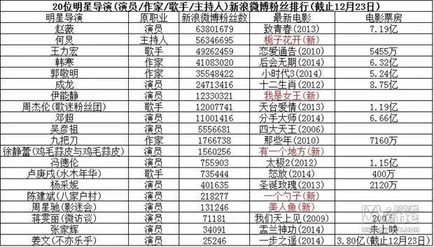 再比如现在已介入电影营销领域的新浪,它通过新浪微博平台可以获得一系列参考数据。比如,之前如果要对艺人的价值作判断,你只能凭直觉知道谁在一线,有多少粉丝。但你不会知道,同样层级的明星谁对男性更有吸引力,谁都女性更有吸引力,80后更喜欢谁,90后更喜欢谁,这些,都可通过大量用户分析得到。