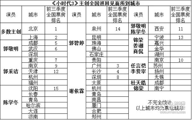 今年,把巡回宣传做到极致的是《小时代3》,所有能参与的演员分批,跑了全国40多个票仓城市(如果每个城市平均按4家影院算,总共跑了160多家影院),除了甘肃、宁夏、新疆、西藏、内蒙、海南,他们的足迹遍布全国。另一个是《分手大师》,导演邓超、俞白眉和主创团队总行程32000公里,飞行时间3321小时,20天跑遍全国87家影院。