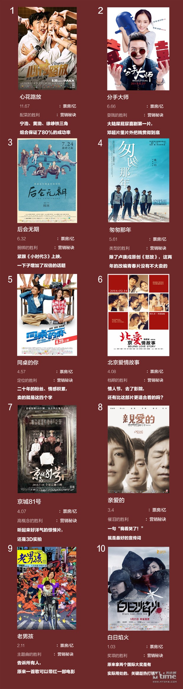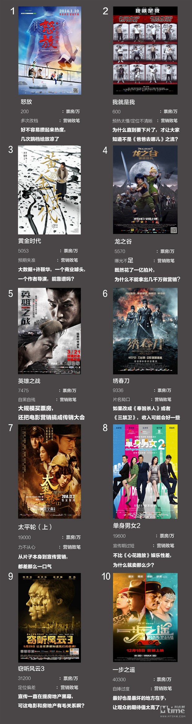 营销本无好坏之分,票房由太多因素决定,因此各类排行榜总是有人认同,有人反对,带有主观色彩的东西。本榜单综合多位业内人士的意见得出,其意义在于指出本年度一些有亮点的宣传营销案例,及一些看起来不够完满的营销结果。