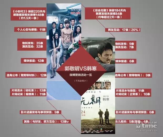 今年,当了导演的韩寒在接受采访时夸郭敬明,他的意思是:团队的人都告诉他,郭敬明在营销方面做的很好,尤其是电影物料的发放,已经成为一个经典营销案例。