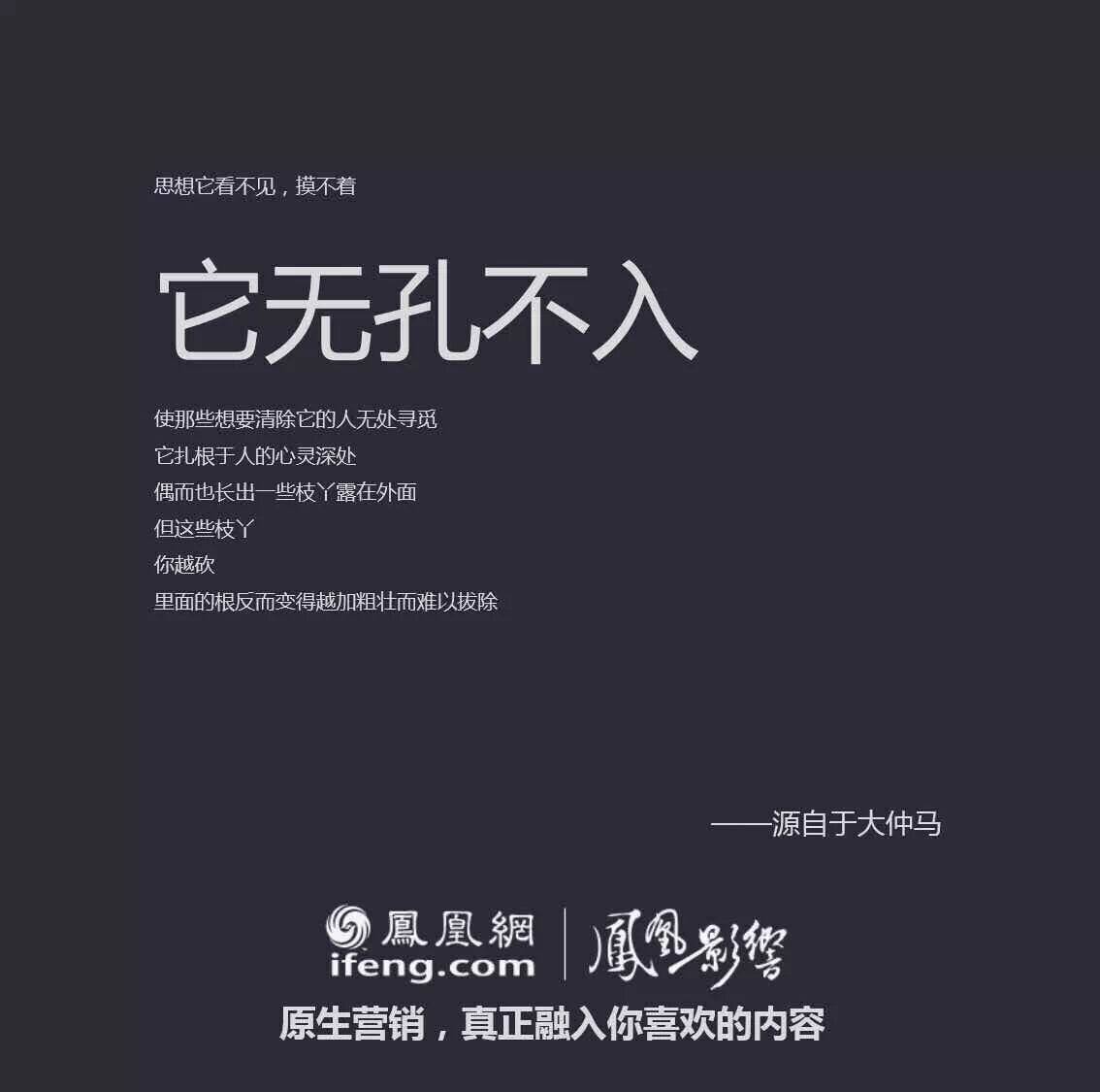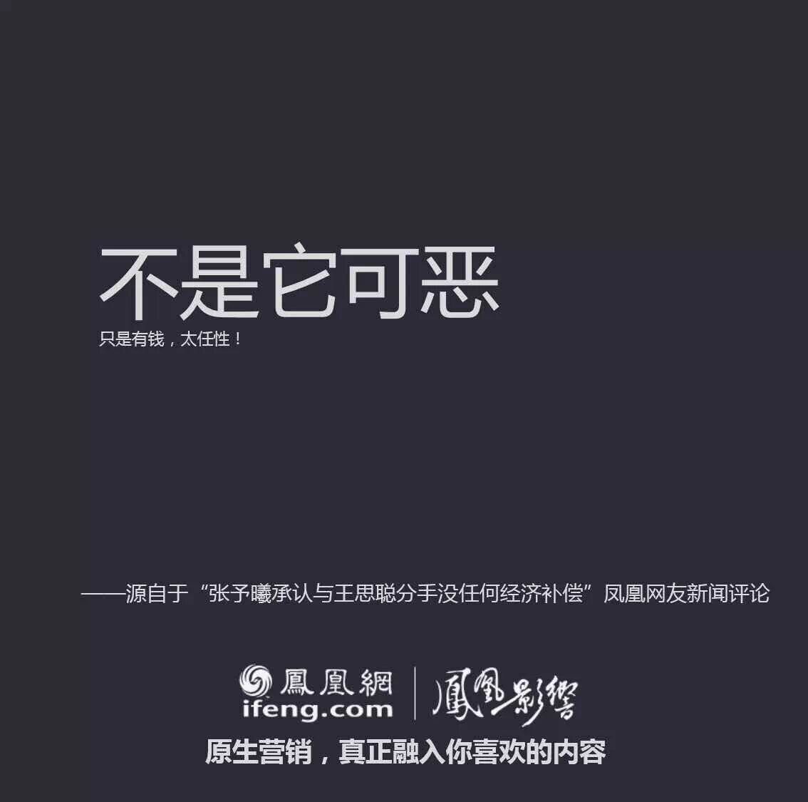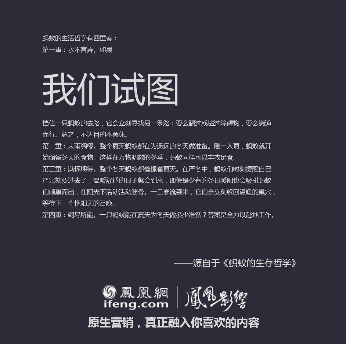 都是在文案上动手脚,易信是把微信的原版改成了“否定句”,凤凰网则是玩起了“扩写”,任性地告诉我们什么是“真正的原生营销”。