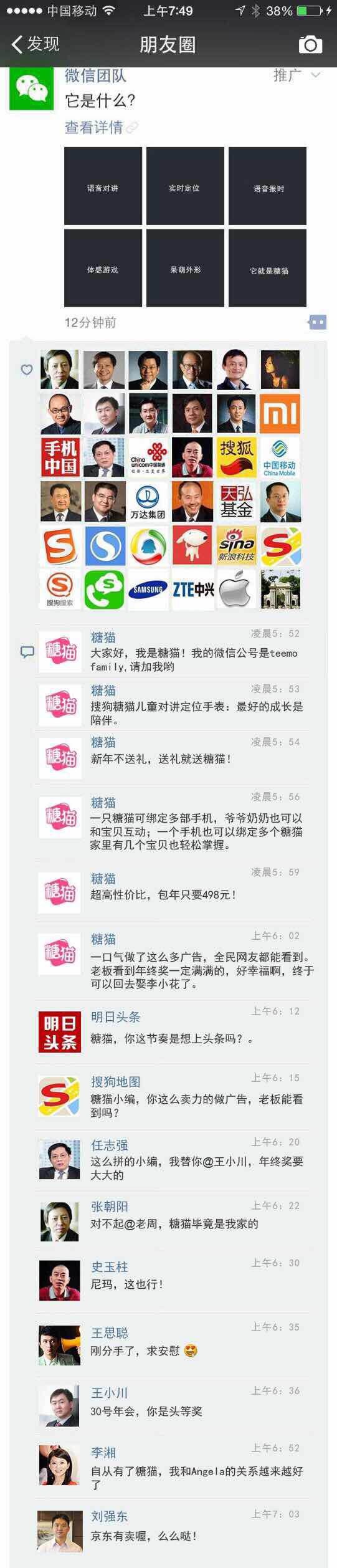 它就是TOP君从没听说过的“糖猫”,百度了下才知道是搜狗旗下的一款智能手表(#告诉TOP君我不是一个人#),它采用的招数是今年效果一直不错的“假想朋友圈”,还杂糅了年终奖的热点话题。