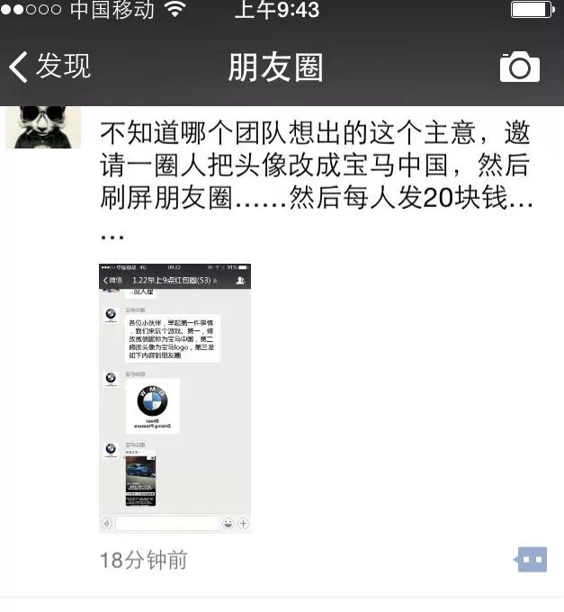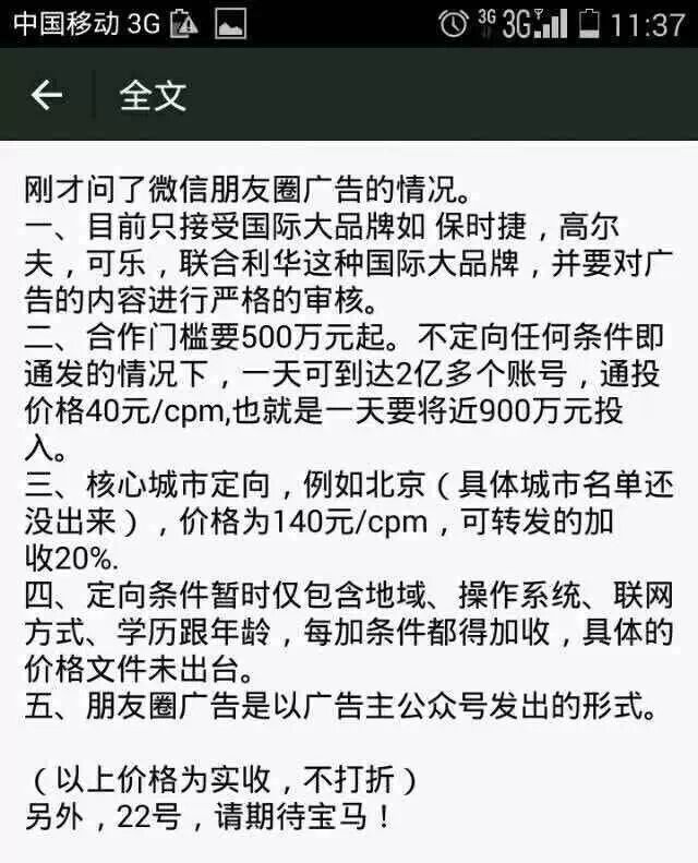 众人心里原本的疑虑重重瞬间就被对宝马的崇拜之情秒杀的渣都不剩。据说微信朋友圈广告至少500万起投,每年在腾讯投放千万的客户们都在排队等候,宝马却在此时以小博大,抢了个头彩,让后面真正花大价钱拿下微信第一条广告的品牌哭晕在厕所,真是高手中的高手:大神在上,请受小弟一拜!