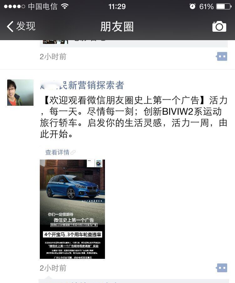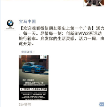 所以,就在昨天,尽管微信官方和宝马官方都没有对此公开承认或否认,“朋友圈第一个广告花落宝马”的春风已经吹遍大江南北,大家也做好了今天一进入朋友圈就敞开胸怀拥抱宝马的心理准备。