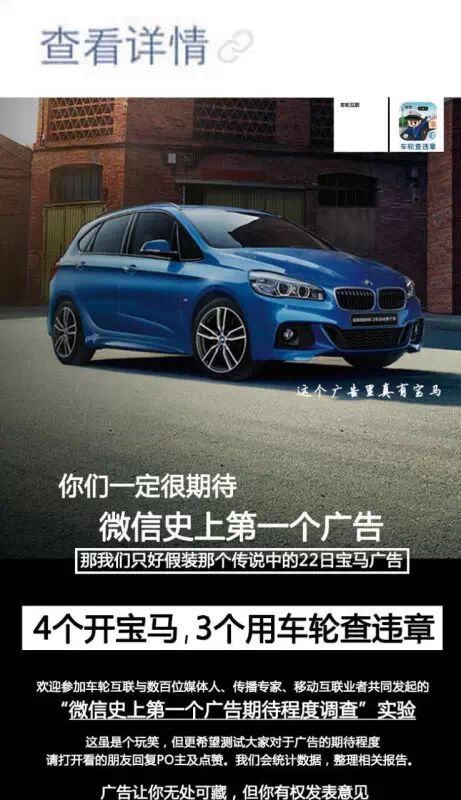 来不及想清楚,情节又有了进一步发展。有人指出,宝马这广告有问题,因为从目前公开的资料来看,微信广告类似普通的朋友圈消息,不同之处在于广告信息右上角将注有“推广”二字,用户可以点击该标示屏蔽它,比如如微信的“它是什么”系列就标有“推广”。但奇怪的是,盛传的“宝马广告”却没有。