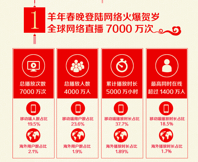 TopMarketing眼睛一闭一睁,春晚已经32岁了,连上30年春晚的冯巩从大哥变成大爷,蔡明也从阿姨变成女王,语言类节目的承包商也变成了郭德纲徒弟。都说30而立,经过各种广告类型尝试的春晚,终于在2015年羊年春晚有了那么点“吸金超级碗”的架势,从电视屏到PC屏到手机屏,广告主蜂拥而至,除凉茶始祖王老吉独家冠名外,还吸引来自多个行业的15家广告主,投广告、搞植入、发红包玩的不亦乐乎。史上的第一次春晚网络直播引起了众多海外媒体的高度关注,包括彭博社、路透社、雅虎财经等在内的283家国际媒体和网络平台对新闻稿进行了报道。那么,春晚营销这笔账,广告主应该怎么算?就让我们拿头年试水的爱奇艺春晚网络直播练练手。