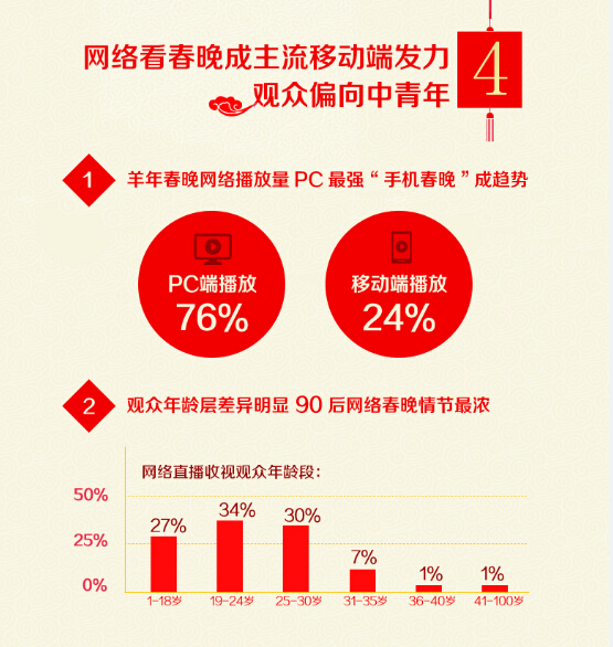 今年,超过900万观众在移动设备上观看了爱奇艺春晚直播,占比23.6%,而这些观众举着手机或平板收视的时间还特别长,播放时长占比近40%。爱奇艺对此现象的解释是,观众厌烦了端坐4小时看电视的体验,想要把电视到沙发的距离无限延伸。客厅、卧室、卫生间,站着、坐着、躺着、趴着,春晚节目分分钟不落下。