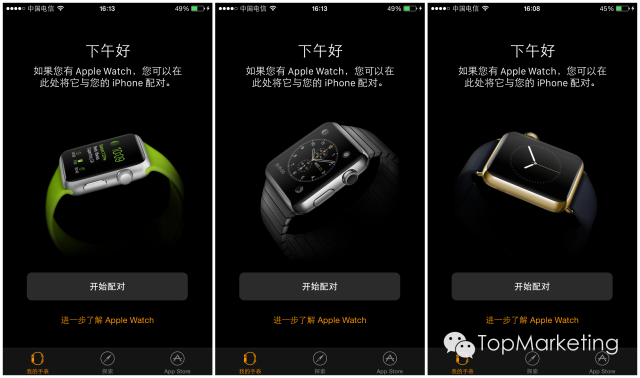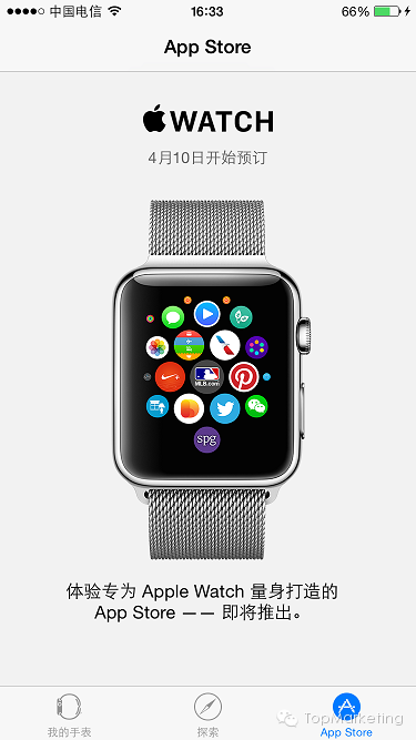 结果再点进去一看,这活脱脱就是Apple Watch的广告啊。Apple Watch里面目前共有三个类目,分别是“我的手表”、“探索”和“APP Store”。