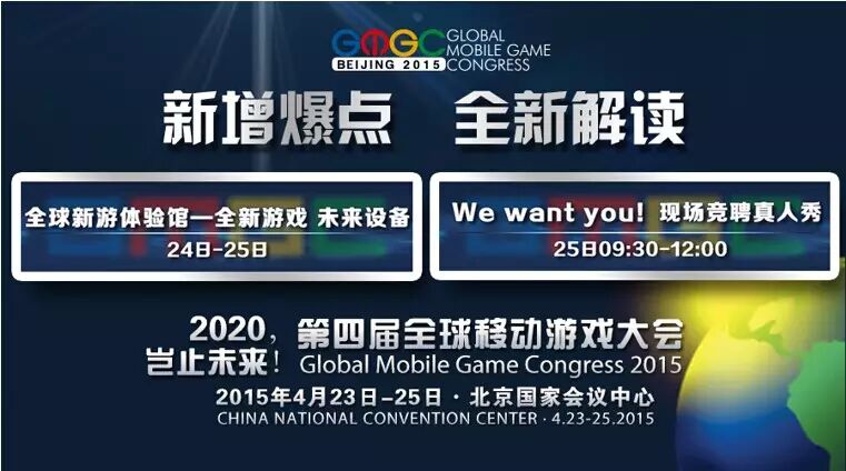 2015年4月23日-25日,由全球移动游戏联盟主办的第四届全球移动游戏大会(GMGC2015)将在国家会议中心CNCC(北京)举办。GMGC2015主题是“2020!岂止未来”,旨在全球布局下,打造移动游戏产业内外部可持续发展的生态链。