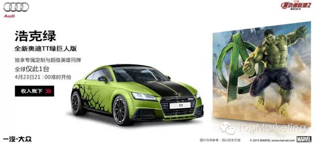 打开奥迪天猫旗舰店(在Tmall.com直接搜索奥迪天猫旗舰店),夺人眼球的便是首页上全新奥迪TT复仇者联盟群英版绿巨人版即将在4月23日给力开拍的消息!不仅如此,还会有“钢铁侠”、“美国队长”、“雷神”和“黑寡妇”对应的特别定制版全新奥迪TT在接下来的几周里陆续开抢的消息。