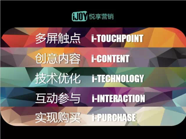 “iJOY悦享营销”,取意于JOY所蕴藏的“愉悦、成功、好运”,是爱奇艺营销服务的价值观和方法论。“iJOY悦享营销”以消费者为核心,用独到策略、高品质内容和创新技术,实时优化互动参与,快速提升品牌并持续拉动销售增长,最终为客户创造愉悦的高ROI营销投放体验。具体说来iJOY悦享营销”包括了5个核心关键词:多屏触点(i-Touchpoint )、创意内容(i-Content )、技术优化(i-Technology)、互动参与(i-Interaction )、实现购买(i-Purchase )。