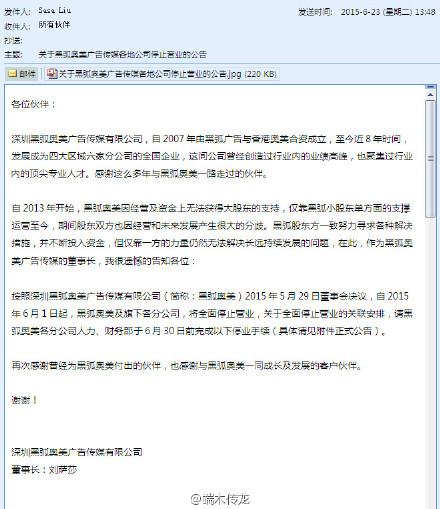 当昨天被神州黑车、高考出分、刘翔离婚占据朋友圈的头条,还有一封来自黑狐奥美董事长刘萨莎的内部邮件截图正在广告圈引起影响,邮件内容表示由于与大股东发生分歧导致资金链断裂,黑弧奥美在6月1号已全面停止营业。