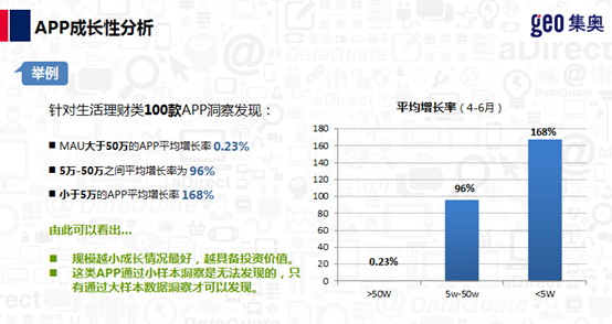 针对生活理财类APP,GEO做了这样一个观察,他们发现目前市面上,Top10 上的APP基本有融资,但如果把这些应用放到图谱上进行比对的时候,很显然,大部分应用处于非常早期的阶段。另外,越是处于小规模的APP,发展前景越好,拿生活理财类APP举例,规模小于5万月活的APP,其平均成长率可达168%,而规模大于50万月活的APP,其平均增长率只有0.23%。以5万月活的早期项目来举例,如果说APP移动整体用户规模将近达到5亿,用目前整个用户当中的渗透率不到万分之一的数值来计算,即使通过一些简单的小样本分析,外界很难发掘它的存在并观察到它的成长曲线。因此,扩大样本、提高渗透率成为当务之急。