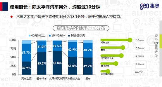 从DAU(Daily Active User,即日活跃用户数量)的情况来看,GEO把汽车DAU做了相应统计,从而反应出客户对APP使用的黏度和喜好程度。从整个汽车市场来说,寡头经济表现非常明显,Top3的前2名被汽车之家和易车霸占。而在用户的黏度和使用情况方面,汽车之家的表现也不错,使用时间比较长。