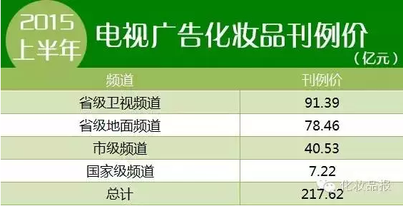 2015年上半年化妆品共有217.62亿元刊例价的电视广告的投入,其中省级卫视频道以91.39亿元成为上半年化妆品电视广告的主要频道,占整个上半年化妆品电视广告的41.99%。
