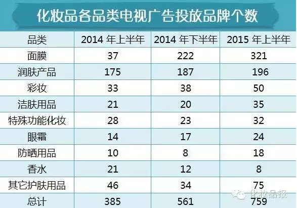 从各品类的增长来看,面膜、香水电视广告投放增长幅度明显。