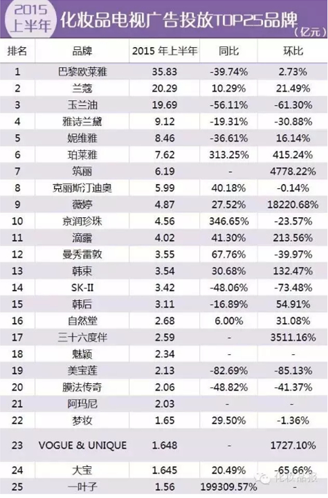 从上半年化妆品电视广告投放TOP25的品牌来看,巴黎欧莱雅、兰蔻、玉兰油分别以35.83亿元、20.29亿元、19.69亿元成为上半年化妆品电视广告投放前三甲品牌。此外值得注意的是,随着微商的崛起,众多微商品牌如筑丽、三十六度伴、魅颖也加入电视广告的投放大军。国产品牌一叶子面膜广告的增长幅度最大,达到199309.57%。