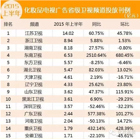 浙江卫视与湖南卫视的综艺制作水平都处于领军地位,今年上半年综艺比拼中更是硝烟四起。剧场方面,湖南卫视势如破竹,钻石独播剧场和青春进行时先后被卡姿兰、温碧泉、伊贝诗和法兰琳卡等化妆品品牌冠名。上半年浙江卫视与湖南卫视的化妆品广告投放稳步增长,投放总刊例均在8亿以上。东南卫视化妆品投放突增,主要是因为微商的品牌筑丽和魅颖的大手笔投放,这两个品牌的投放占东南卫视化妆品总投放的65%。