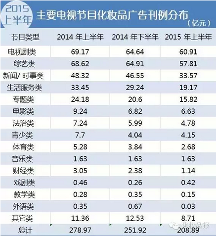 从化妆品电视广告的分布来看,电视剧、综艺类、新闻/时事类节目期间广告最受化妆品企业欢迎,2014年上半年至2015年上半年均创造了最大的广告价值,主要是因为这几档节目的观众定位和化妆品的消费人群相对较为吻合。电视剧类以60.91亿元成为上半年化妆品广告投放最多的节目。