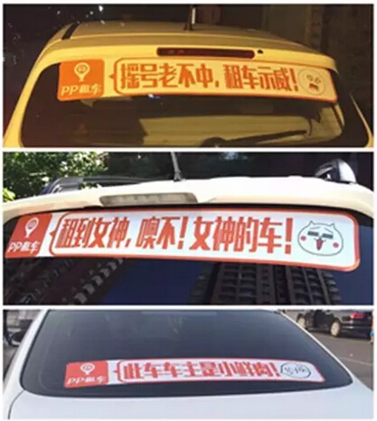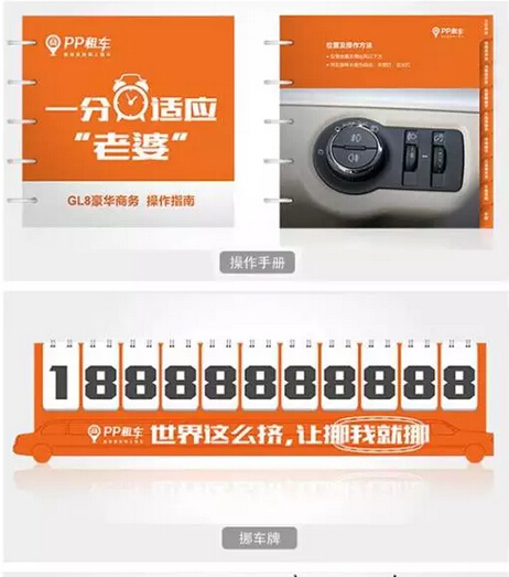 再举一个我们自己的案例。我刚加入PP租车的时候(植入硬广:PP租车是亚洲最大的私家车共享平台,可以让你就近低价便捷地租用邻居的好车),就一直在思考,我们没有店面,跟用户接触最多的实物就是车辆,那就需要在车上做文章,如何让平台上出租的车辆变成传播品牌的载体。