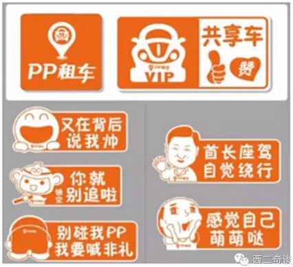 我们最近就做了些尝试,先是制作了一些有趣的车贴,免费发给员工和车主,让大家一起推广共享经济的时尚、环保的理念以及PP租车的品牌: