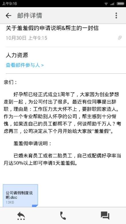 10月29日党的十八届五中全会允许实行普遍二孩政策,一款叫做好孕帮的APP就借势给公司员工一大福利——每月一天“羞羞假”,可以回家造人。