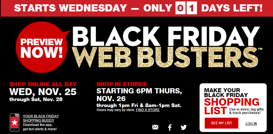 再来看下各大商铺的黑五预热,TOP君好想剁手!!!各百货的黑五促销包括了线下(DoorBusters)和线上(WebBusters),线上活动今天已经开始(周三),店铺活动感恩节当天下午5:00或6:00正式启动,为了保证线上线下不打架,有些商品是线上独享,有些商品则是线下定时抢购,部分商品限时供应。
