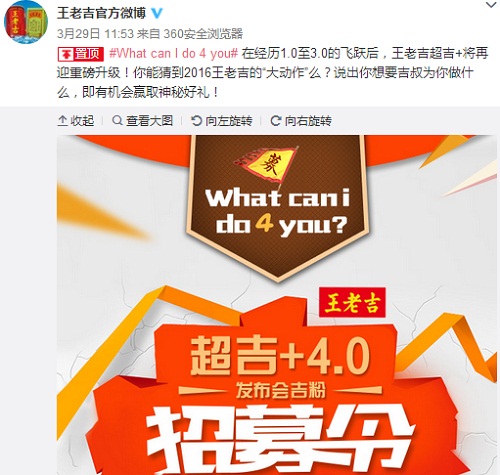 比如,最近TOP君就发现王老吉在微博搞了一个悬念营销,晒出了“What can I do 4 you”的悬念式海报,邀请大家一起来猜王老吉“超吉+”4.0。