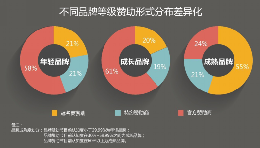 在成熟品牌间激烈竞争的高压下,品牌砸重金赞助热门节目的意愿也更强烈。55.2%的成熟品牌偏爱冠名形式赞助,荣获最“贵族”奖。年轻品牌和成长型品牌还处在“赞助”的试水状态,较多会选择“官方赞助商”。
