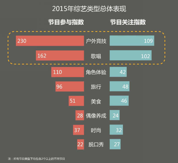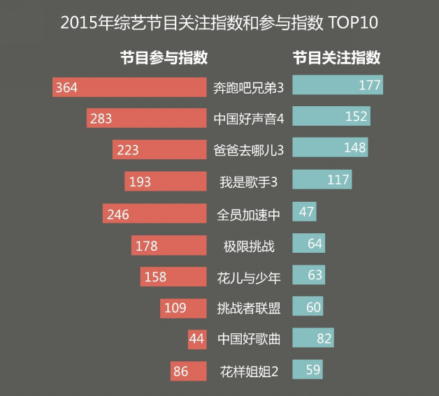 《奔跑吧兄弟》系列堪称2015年“黄金圣斗士“。第三季的播出不但顶住前两季压力,并爆发出强劲的后续力量,节目表现指数达到历史性的233.26。值得一提的是,2015年首季播出的《全员加速中》以情境游戏形式,融合多重元素,成功激发了网友的讨论热情,节目参与指数达到245.5,甚至超越《爸爸去哪儿3》, 最脑洞大开节目实至名归。