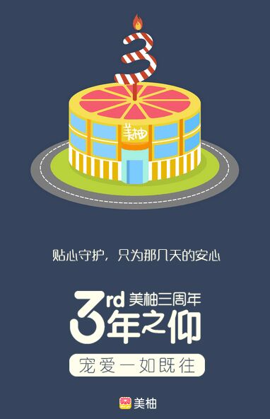 美柚的官方微博在4月15日10时发出一张海报,3周岁的蛋糕上是其logo的西柚形象,文案是:贴心守护,只为那几天的安心。而下面是周年庆的大主题:三年之仰,宠爱一如既往。以旁观者的角度可以直接地看出,讲的是三年期间所专注的信仰,对于女生的宠爱不变。