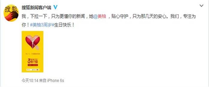总结经验,不难发现,品牌的周年庆已不再是一场自娱自乐的独角戏,此次美柚的周年品牌联动,可以预见其早有准备,谈“感情”不伤钱,借周年庆联合各家品牌发布海报为自己庆生,一方面用有趣、拟人化的社会化营销方式增加了品牌的曝光率,吸引媒体和公众的注意力,在微博上掀起一阵浪潮;另一方面,像京东、搜狐、百度等品牌都属于活跃在社交媒体中的知名品牌,粉丝和用户看到这样的品牌互动,无形之中也会增加对美柚的好感度和信任感。