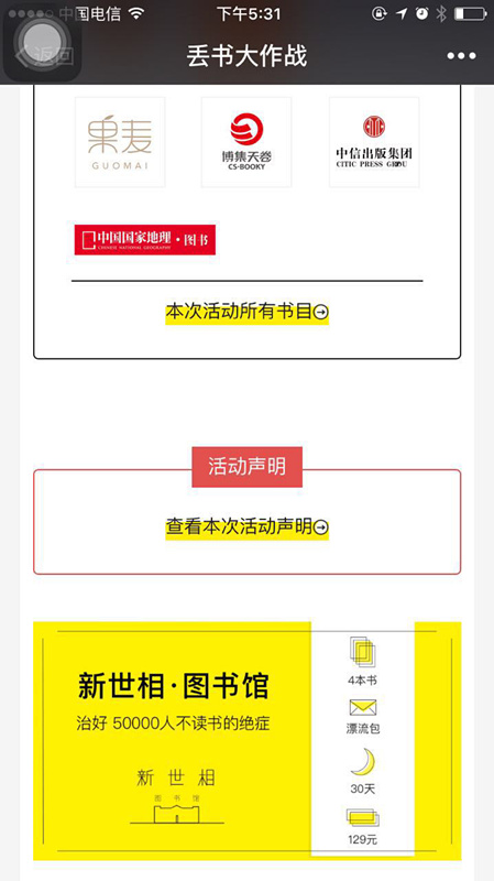 模仿也就算了,它虽然美其名曰这是带有公益性质的图书分享,但大家都知道这是新世相在联合品牌推广自己5月刚上线的新世相图书馆。