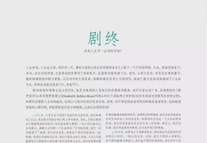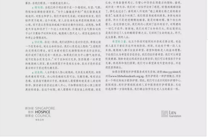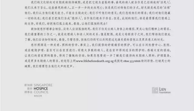 新加坡慈怀理事会成立的宗旨,就是为晚期病人及他们的家属提供服务。我们刊登这则广告,是想帮助你了解伊丽莎白·库尔勒罗斯博士所确认的五个面临死亡的阶段(也关系到面对悲痛及丧亲的过程)。如果你未曾跌入生命的幽谷,这死亡之说对你或许多余。然而,对于那些刚被宣判死亡的绝症患者而言,这段晚期病患的心路历程,将能照亮他们前方的暗路,让他们走得更舒坦!