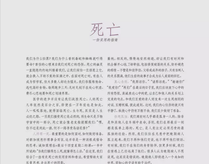 解开心结。“你希望将来怎么死呢?”面对这个问题,大多数人或许选择回避:“我还没活够呢!”“大吉大利,我要活到一百一十岁!”我们希望怎么去死?不辞而别的骤然离世看起来很干脆,但我们有很多心愿未了,很多事来不及交代,而家人也难以接受这种突如其来的噩耗。相反的,慢慢地安详病逝,却让我们有时间和机会解开心结,了却牵挂,包括修复破裂的关系,弥补褪色的感情—不管是和前伴侣、父母或成年的孩子。只有当两人的关系圆满,他们生前的故事才会成为后人美丽的回忆。