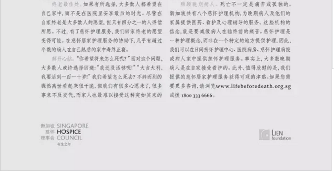 照顾晚期病人。死亡不一定是痛苦或孤独的。新加坡共有八个慈怀护理机构,为晚期病人及他们的家属提供医药、看护及心理辅导的服务。这些机构的信念,就是要缓解病人在临终前的的痛苦。慈怀护理是一种护理概念,而非在一个特定的地方提供护理,因此,我们可以在日间慈怀护理中心、医院病房、慈怀护理病院或病人家中提供慈怀护理服务。事实上,大多数晚期病人是在自家接受看护的。此外,值得欣慰的是,我们提供的慈怀居家护理服务获得可观的津贴。如果您需要更多咨询,请浏览www.lifebeforedeath.org.sg或拨18003336666。