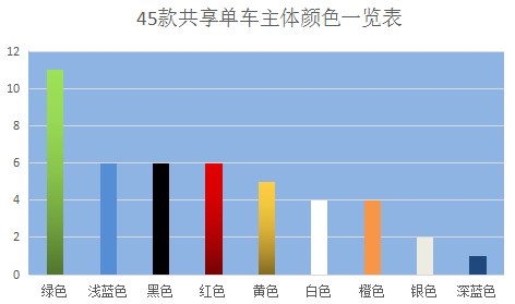 共享单车撞色撞得有多惨烈,看看下面这张本君自制的“共享单车颜色表”(背景色是共享单车的主要颜色,字体颜色是车身上的其他颜色)就知道了。别的暂且不提,有着“绿色出行”天然背书的绿色,单在出街的45款中就有11款,想找到想骑的那款,也真是心累。