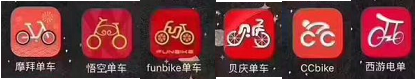比如摩拜、悟空、funbike、贝庆、CCbike和西游电单,都是红(橙)色背景里有一辆白色的自行车,乍一看还真是傻傻分不清。