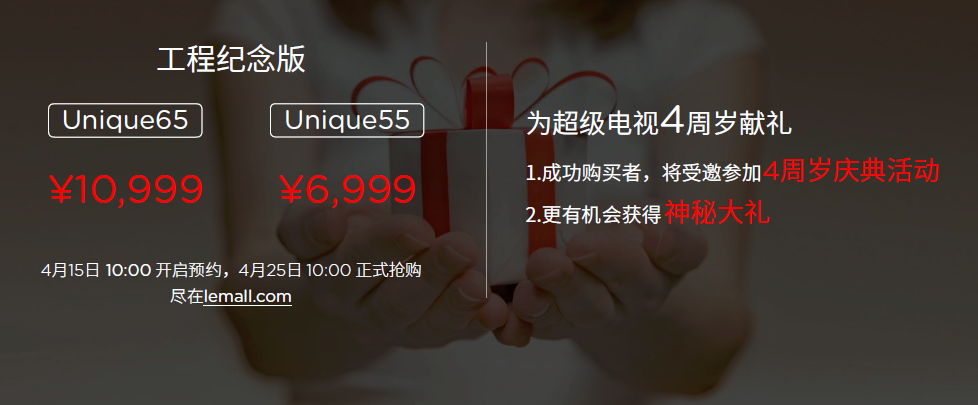 此外,乐视秉承UP2U的理念,希望广泛收集用户对新品反馈,特推出Unique系列工程纪念版:Unique65工程纪念版,定价10999元,Unique55工程纪念版,定价6999元,4月15日开启预约,4月25日10点LeMall限量抢购。为答谢广大乐迷,成功购买Unique工程纪念版的用户,将受邀参加超级电视4周岁庆典活动,更有机会获得神秘大礼。