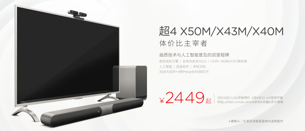 此外,乐视首发三款画质里程碑新品:50吋超4 X50M,定价3299元;43吋超4 X43M,定价2599元;40吋超4 X40M,定价2449元,均采用乐视四大画质优化新技术,并搭配Mstar6A938处理器,3+16GB存储配置(生态版3+32G),传承超级电视诸多优秀设计基因,如支持HDR10高动态范围、杜比音效(Dolby Audio)解码和后处理技术、DTS解码等,并标配智能语音遥控器。3月29日开启预约,4月6日10点LeMall/LePar/京东/天猫/苏宁易购同步开放购买。
