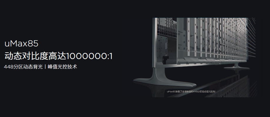 提升直式下动态对比度的有两种常见技术,多分区动态背光控制和峰值光控技术。多分区动态背光控制通过将背光划分为多个独立控制的区域,然后根据每个区域的图像亮度信息,动态控制相应区域的背光亮度,从而呈现出更好的动态范围,让你看到的画面层次感更清晰。而峰值光控技术可以进一步提升动态对比度,不同产品根据需要可以选择不同设计方案。超级电视uMax85,就采用448分区动态背光控制和智能峰值光控技术,其动态对比度可以达到100万:1。