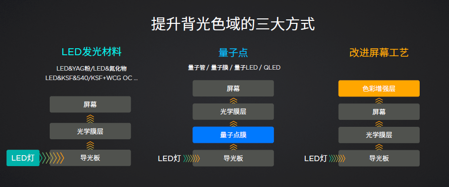 色域的提升方式,主要是利用材料技术的发展作为主要技术手段,提升最为直接的像量子点技术,还有在LED灯里加入新型荧光或发光材料,此外,屏幕厂商也在屏幕设计上,开始考虑加入特制的彩色滤光膜,来增强色域。第4代乐视超级电视全部达到NTSC 85%高色域,在中国电视行业里,乐视可能是第一家。