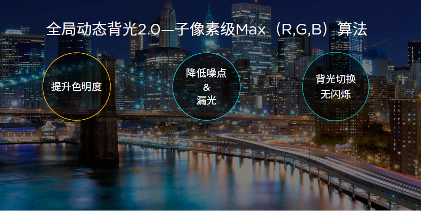 1、子像素级全局动态背光:这是在常规动态背光设计基础上,通过子像素级Max(R,G,B)算法,运算精度为原来提升3倍,提升色明度。此外,还能优化动态背光曲线,增加动态背光作用范围,使得暗场亮度达到0.005nit,降低噪点和漏光,同时优化背光切换速度和平滑度,切换无闪烁。