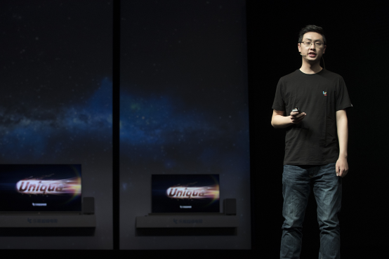 “今天,我们正式发布超级电视家族的全新产品系列,Unique,生来独孤求败。新品65吋Unique65和55吋Unique55携带着两大创新科技——全面屏、新分体。”梁军介绍说。