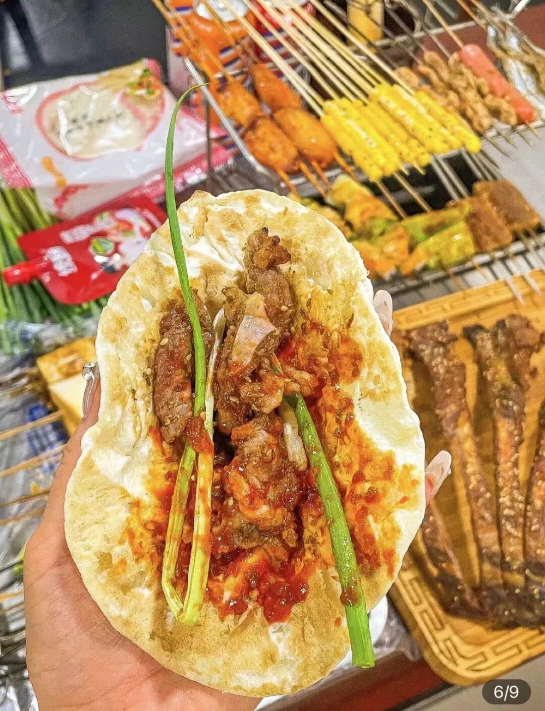 按照当地人教的方法,先用加热后的小饼,蘸上蘸料、放上小葱、最后把肉串放进小饼里用饼一夹以撸,嘿!一个淄博版的TACO就就这么做好了。阅菜无数的刘超咬了一口,鲜嫩多汁的烤羊肉串混着口感丰富的蘸料,加上灵魂小葱激发出的辛辣清香,这一口下来,脑海中闪现出两个字“幸福”!