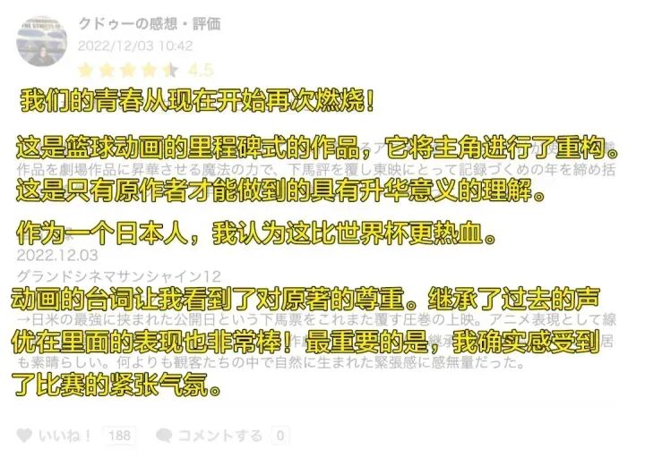 从电影正式上映开始,《灌篮高手》的评分就呈现出两极分化,上映当天,电影在日本yahoo评分为2.8分(满分5分),在Filmarks的评分则为4.4分(满分5分),当你单看某个平台的评分,很容易出现这部电影“爆了”或“糊了”的错觉。