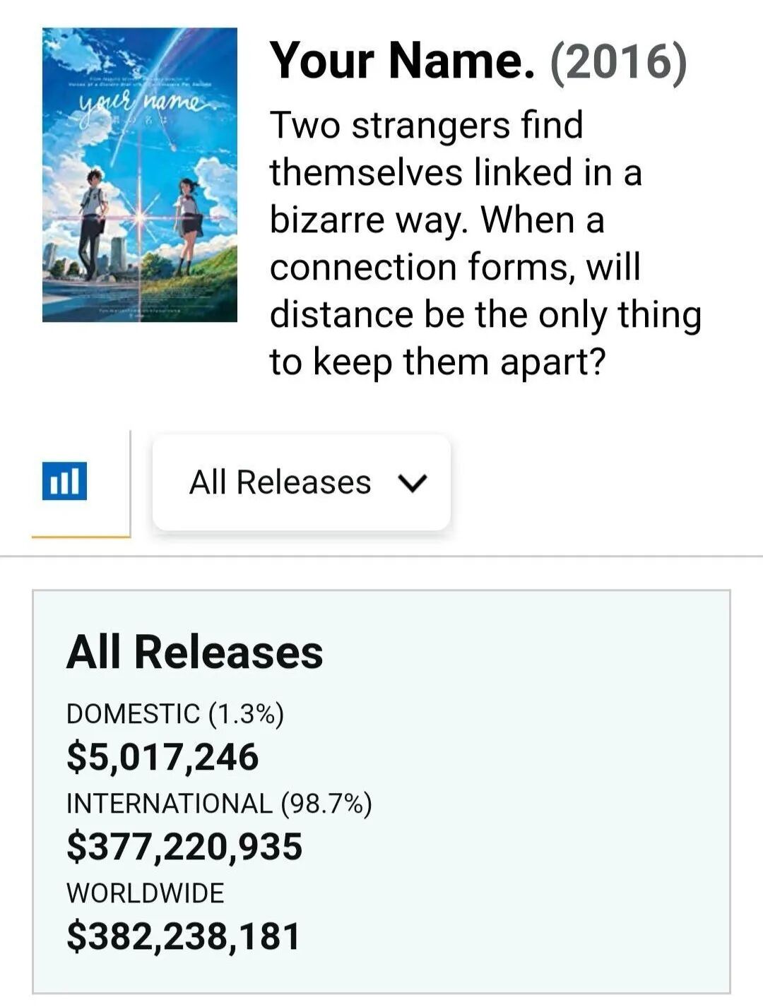 回顾新海诚《你的名字》全球票房3.8亿美元,其中日本本土2.3亿美元,中国市场贡献了8300万美元。《天气之子》全球票房1.9亿美元,其中日本本土1.3亿美元,而中国市场贡献了4000万美元。截止到目前,《铃芽之旅》全球票房1.3亿美元,其中日本本土1亿美元,目前中国票房尚未计入全球票房数据。