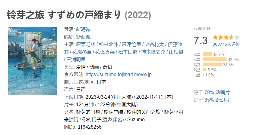新海诚因《你的名字》《天气之子》等前作积累的口碑,足以为《铃芽之旅》的品质做背书。而且,新海诚导演在上映前不久,亲赴北京、上海等地进行宣传,在豆瓣上,他甚至“亲自”为观众解读这部电影,前期营销做得亲民又周到。外加新海诚作品浪漫唯美的画面,每一帧都值得当屏保……这些都是《铃芽之旅》成功的因素,但不是受欢迎的根本。