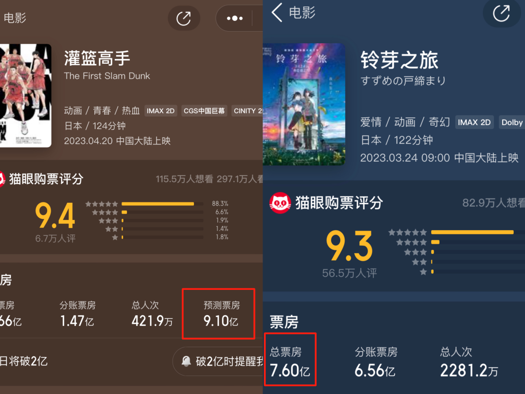 最新的猫眼专业版显示,目前《铃芽之旅》的票房已经过7.6亿,而《灌篮高手》的票房预估则从7亿被上调至9.1亿。显而易见,日本动画在今年春天的表现“相当炸裂”。